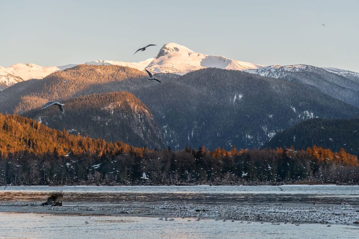As the fishers gather, so do hundreds of gulls and eagles. So many gulls can appear at once that the flock shivers across the sky like an apparition. “My grandmother would say, ‘When you see the white ghost coming up the valley, you know the eulachon are coming,’” says fisherman Ian Morven. There are so many birds in Fishery Bay some seasons, locals insist, that you cannot see the sky. One observer in the mid-1800s compared the spectacle to a heavy snowfall. The birds feast and squabble and take river-rafting adventures on driftwood as it surfs toward the river’s terminus, roughly 15 kilometers (9 miles) to the west, where the water spills into Portland Inlet, north of Prince Rupert, British Columbia.