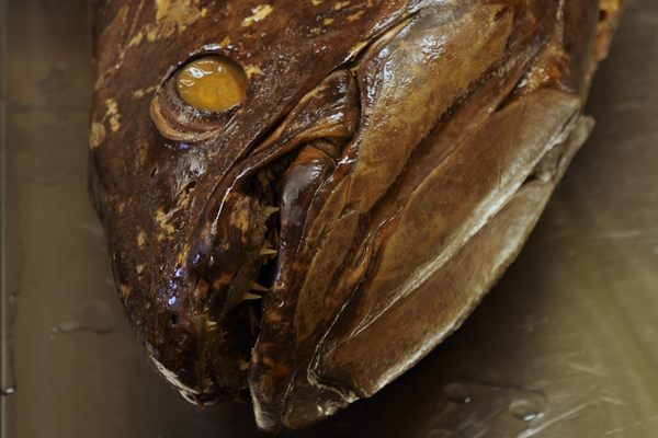 Peering into one of the vats after the cook is done, I can see a thick, fuzzy gray layer of detritus lining the bottom and the occasional bone sticking up, left behind as the golden-hued oil rose to the top. The eulachon has been separated first from the river, and now from its constituent parts. It has taken on a new form, just as the river water rushing past the hut will rise as vapor when the warmer days of spring arrive, to fall again later as rain. Though nature’s cycles are increasingly uncertain, the Nisg̱a’a relationship with the beloved oily oolie is steadfast. Once the grease is ready, the workers will siphon it off and strain it into jars—preserving a taste that links hundreds of generations of human and fish for another season.