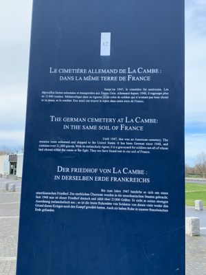 The American cemetery of St Laurent-sur-Mer was created for those remaining in France. In 1954, it was decided to develop the cemetery at La Cambe as one of six German cemeteries in Normandy. Until that time, many of German dead had been buried in field graves and small cemeteries throughout the area.